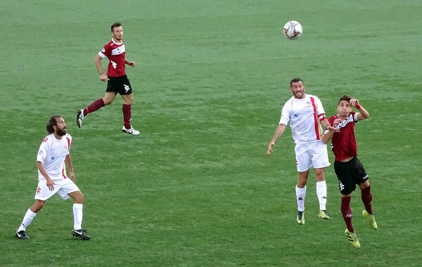 Fotografia: Dalmasso, in maglia granata, ingaggia un duello aereo con Montante in un Borgosesia-Bra 1-0 giocato il 17 settembre 2017.